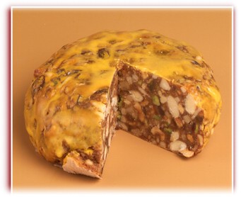 uvetta 250 gr.mandorle 75 gr.gherigli di noce 50 gr.nocciole tostate 100 gr.frutta candida 150 gr.fichi secchi 125 gr.pinoli 50 gr.cioccolato fondente 100 gr.miele 100 gr.pasta da pane 80 gr.olio d'oliva 3 cucchiai di farina 330 gr. Uova + 1albume 2sale, q.b. spezie miste 1 pizzicocacao 2 cucchiai di rhum 3 cucchiai di zuccheroPreparazione: