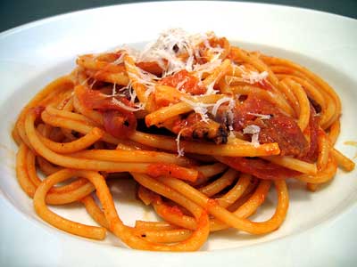 Ingredienti per 4-6 persone 600 g. di bucatini fatti a pezzi 160 g. di guanciale molto magro, tagliato in pezzi piuttosto grossi) 2 cucchiai scarsi di olio 1/4 di cipolla tritata fine La polpa di 5 pomodoretti molto asciutta e tagliata a filettini fini Un pezzo di peperoncino 100 g. di pecorino grattugiato Sale e pepePreparazione: