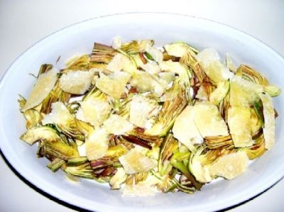 Per 4 persone: 6 carciofi con le spine 3 limoni (solo succo) 5 cucchiai di olio sale pepe 100 gr di Emmenthal o parmigiano o BriePreparazione: