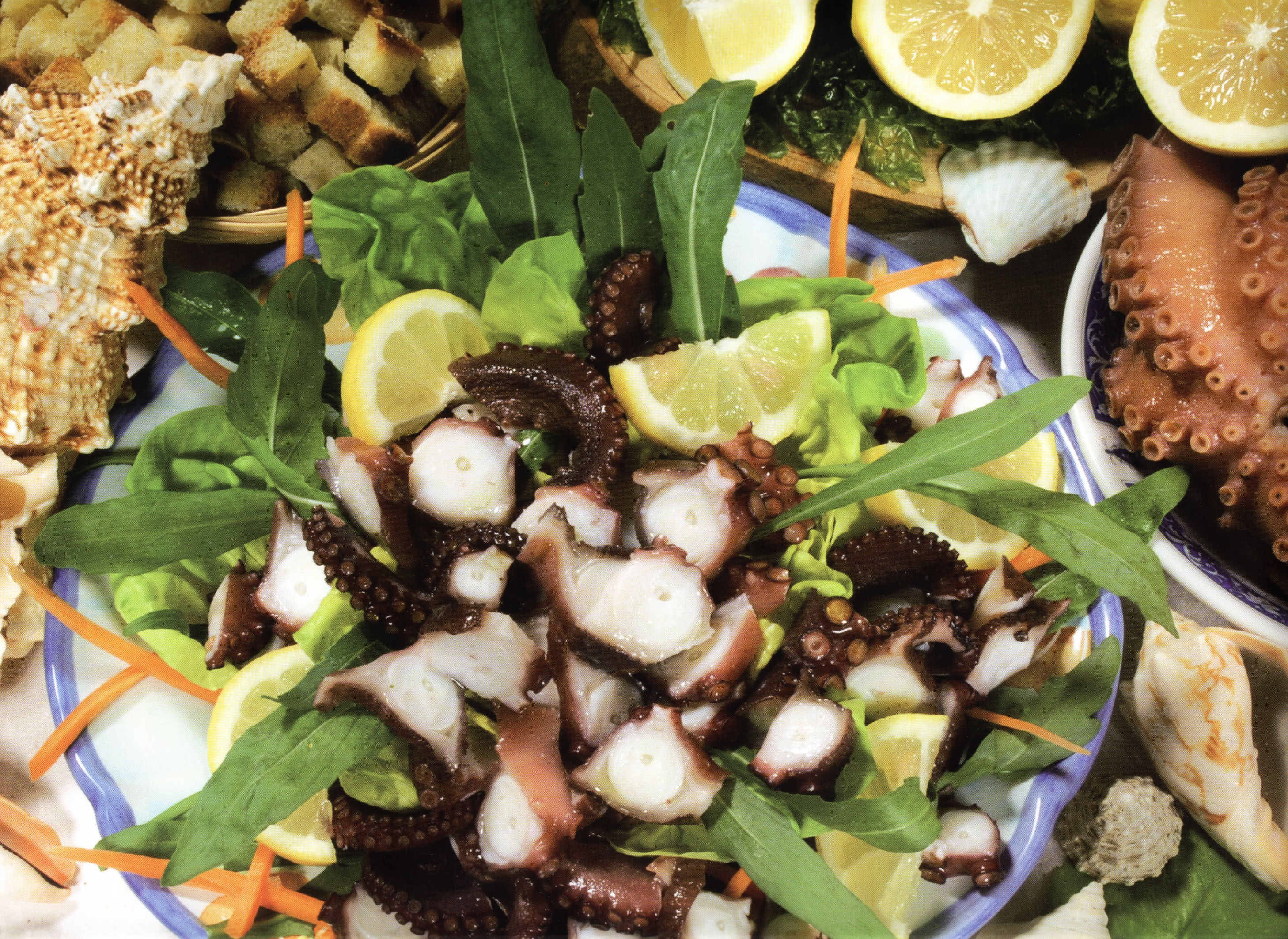Prendete i polpi in mano e batteteli, onde ammorbidirli, su una superficie di marmo o simile (con energia). Puliteli levando loro la bocca, gli occhi, la veschichetta dell'inchiostro e lavateli poi in parecchia acqua corrente. Mettete a bollire dell'acqua salata, gettatevi i polipi e fate cuocere per circa un'ora o comunque sino a che non siano diventati ben teneri. Prendete il prezzemolo e tritatelo finemente con l'aglio; quando i polpi sono cotti tagliateli a fettine, versatevi sopra l'olio e il succo di limone e cospargete con il prezzemolo e l'aglio.
