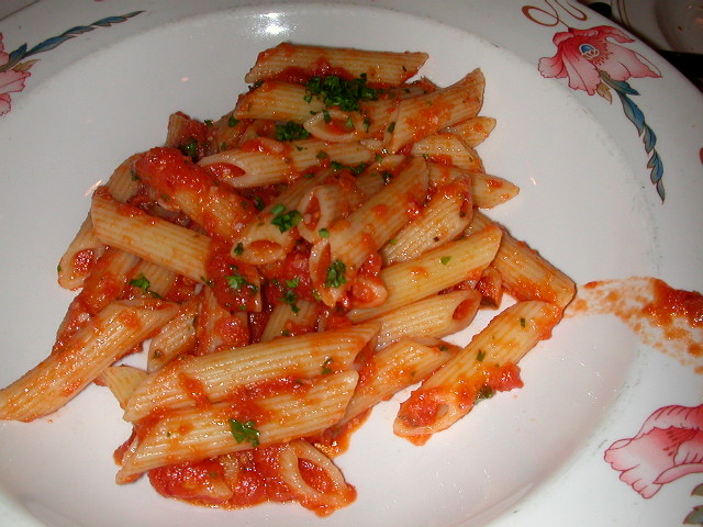 400 gr di penne 100 gr di pancetta 1 spicchio d'aglio 2 peperoncini piccanti 500 gr di pomodori pelati 100 gr di parmiggiano grattugiato Basilico, sale ed olioPreparazione: