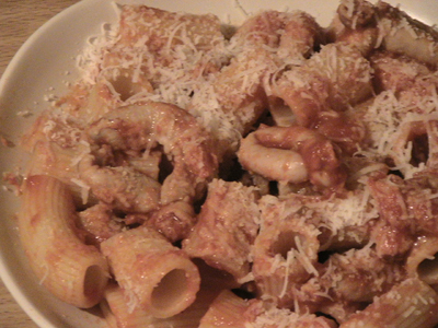 400 gr di rigatoni 600 gr di pajata (pagliata) di vitello 1 spicchio d'aglio 1 costa di sedano 1 bicchiere di vino bianco 50 gr di strutto (o olio) 500 gr di pomodori pelati 80 gr di parmiggiano grattugiato salePreparazione:
