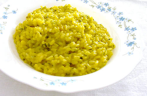 Ricetta tradizionale La vera ricetta prevede l'utilizzazione di un po' di midollo di bue (da 10 g a 50 g) da far sciogliere insieme al burro ma ora è vietato l'uso. Comunque sia il segreto per la buona riuscita di questo tipico piatto milanese è l'uso di uno zafferano di prima qualità. Si può anche arricchire con funghi oppure con qualche pezzetto di salsiccia a nastro; in questo modo abbiamo un ottimo piatto unico. A ltrimenti si serve come primo e come secondo si può servire la carne utilizzata per preparare il brodo. Preparare il brodo. Sbucciare la cipolla e metterla, intera, in una pentola con circa due litri d'acqua. Aggiungere la carne di manzo, in un sol pezzo, aggiustare di sale e avviare la cottura a fuoco molto basso e a pentola semicoperta per circa un'ora. A questo punto aggiungere il pollo e il tacchino e proseguire la cottura per un'altra ora, sempre a fiamma bassa e a pentola semicoperta. Sgrassare il brodo, filtrarlo e tenerlo a bollore mentre si cuoce il risotto. Sbucciare e tritare la cipolla; metterla insieme alla metà del burro in una casseruola e farla soffriggere a fiamma molto bassa senza farla dorare. Si può, eventualmente, aggiungere un cucchiaio di brodo e proseguire la cottura. Unire il riso, farlo tostare per uno o due minuti, mescolando con un cucchiaio di legno, e poi incominciare ad aggiungere un mestolo di brodo. Far cuocere per 16-18 minuti o secondo le istruzioni riportate sulla confezione del riso, mescolando e continuando ad aggiungere brodo bollente. Unire lo zafferano pochi minuti prima della fine della cottura. Prima di togliere dal fuoco, aggiustare di sale e mantecare col resto del burro e con il grana grattugiato. Servire caldo Suggerimenti per una cucina più veloce e più leggera - al posto del burro abbiamo utilizzato 4 cucchiai di olio extravergine d'oliva e alla fine abbiamo mantecato solo col parmigiano - se vogliamo un piatto ancora più leggero, prepariamo del brodo con il dado, al posto della cipolla usiamo un paio di cucchiai di erba cipollina e aggiungiamo un cucchiaino di maggiorana - un altro suggerimento è di insaporire con del buon vino rosso il riso dopo averlo fatto tostare, farlo evaporare e solo dopo aggiungere il brodo bollente