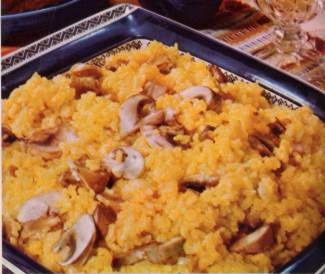 Ingredienti per 4 persone: 300 gr. di riso 1 cipolla 50 gr. di burro 1/2 bicchiere d'olio 1 pizzico di zafferano sale pepe 1 litro di acqua 60 gr. di formaggio grattugiato 100 gr. di funghiPreparazione: