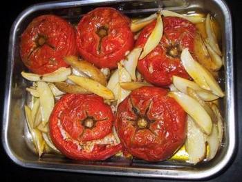 Per 4 persone: 4 pomodori rossi da riso 6 cucchiai di riso per risotti 4 cucchiai d'olio extravergine di oliva due cucchiaini di sale fino uno spicchio d'aglio patate pepe a scelta: una spolverata di origano basilico abbondante prezzemoloPreparazione: