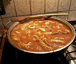 La prima cosa da fare è pulire il pesce: i pesci più grandi vanno decapitati, sviscerati e diliscati, tenendo comunque il tutto gelosamente da parte. Quindi si tagliano i filetti in tranci di medie dimensioni. Si mette metà dell’olio e si fa imbiondire metà delle cipolle, dell’aglio, della salvia e del prezzemolo. Si mettono a cuocere i tranci di filetto, scottandoli e facendoli dorare da ambo le parti, quindi si bagna con un bicchiere di vino, lasciandolo lentamente evaporare. Si aggiungono allora i pelati sfatti, e si lascia sobbollire per alcuni minuti. Tolti dalla casseruola i filetti di pesce, li si conserva al caldo, mettendo da parte la salsa con i pomodori. Nella casseruola si mettono poi tutti i pesci piccoli, i resti di quelli grandi, e le cicale di mare. Si rosola il tutto per una decina di minuti, aggiungendo sale, pepe, e bagnando con due bicchieri di vino. Una volta evaporato il vino, si aggiunge il concentrato di pomodoro e mezzo litro di acqua, lo si lascia ridurre della metà e, infine, lo si passa finemente con un passino. Si versa poi la crema nella casseruola di cottura e si aggiunge a parte la salsa di pomodoro. Ancora a parte, si bolle il polpo tagliato a tranci e se ne conserva l’acqua di cottura. Il trancio del polpo non va gettato nell’acqua bollita, ma infilzato in un forchettone e immerso per varie volte nell’acqua bollente, per poi ritirarlo via rapidamente. Si noterà che il tentacolo tende ad arrotolarsi. Questa operazione serve a evitare che il polpo diventi troppo duro. In un’altra casseruola, infine, si cuociono le seppie e i totani, tagliati a strisce, con l’altra metà dell’olio e degli odori, si bagna con il restante vino e lo si fa evaporare prima di aggiungere l’acqua di cottura del polpo. Il composto va lasciato a bollire fino a ridursi della metà. A questo punto si unisce tutto nella casseruola, si scalda e si regola di sale, pepe e peperoncino. Per un risultato ideale, le fette di pane vanno tostate e strofinate con l’aglio, quindi disposte in ogni piatto: una prima fetta sul fondo e le altre tre in verticale sui bordi. Ora si può distribuire nelle scodelle la zuppa, servendola ben calda.